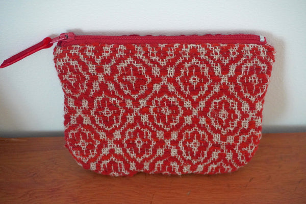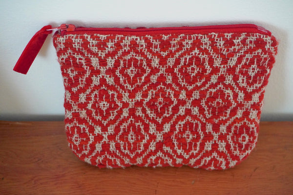 Petite pochette en laine rouge rustique et lin naturel tissée à la main dans une technique traditionnelle nord-américaine appelée Frappé colonial, ou Chèvrefeuille, sur un métier à tisser Leclerc.
