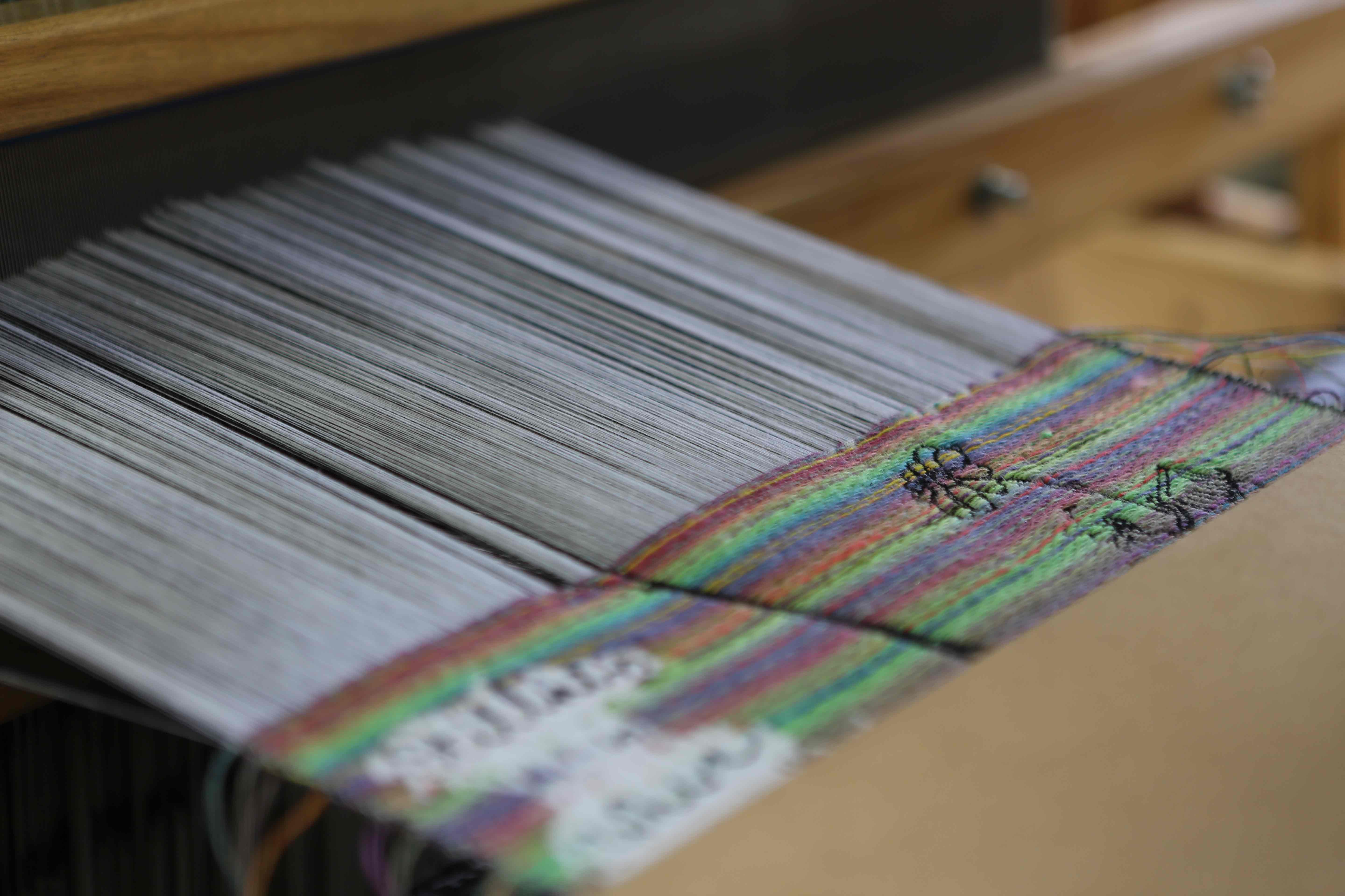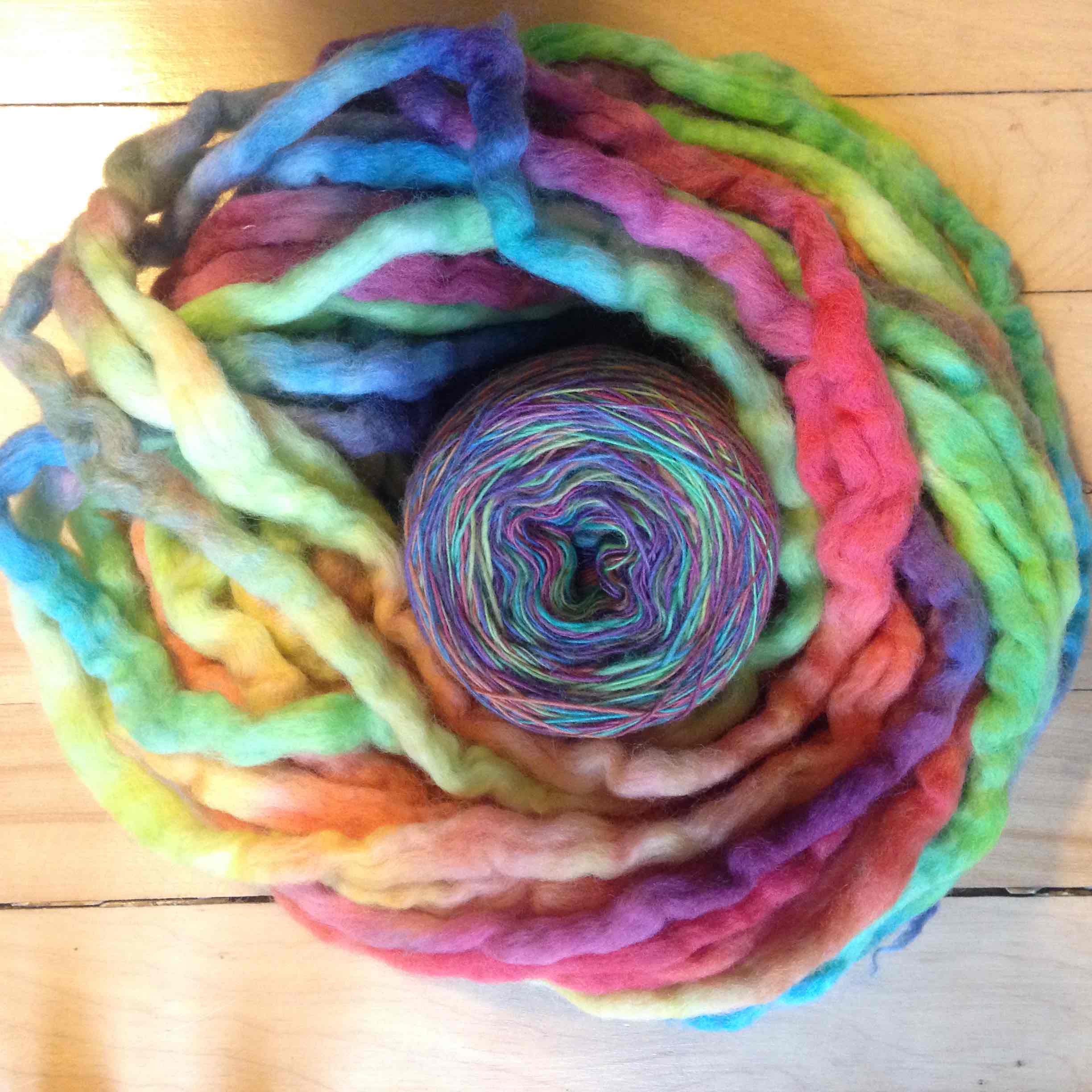 Materials: Hand-dyed and hand-spun wool, cotton, linen, polyester