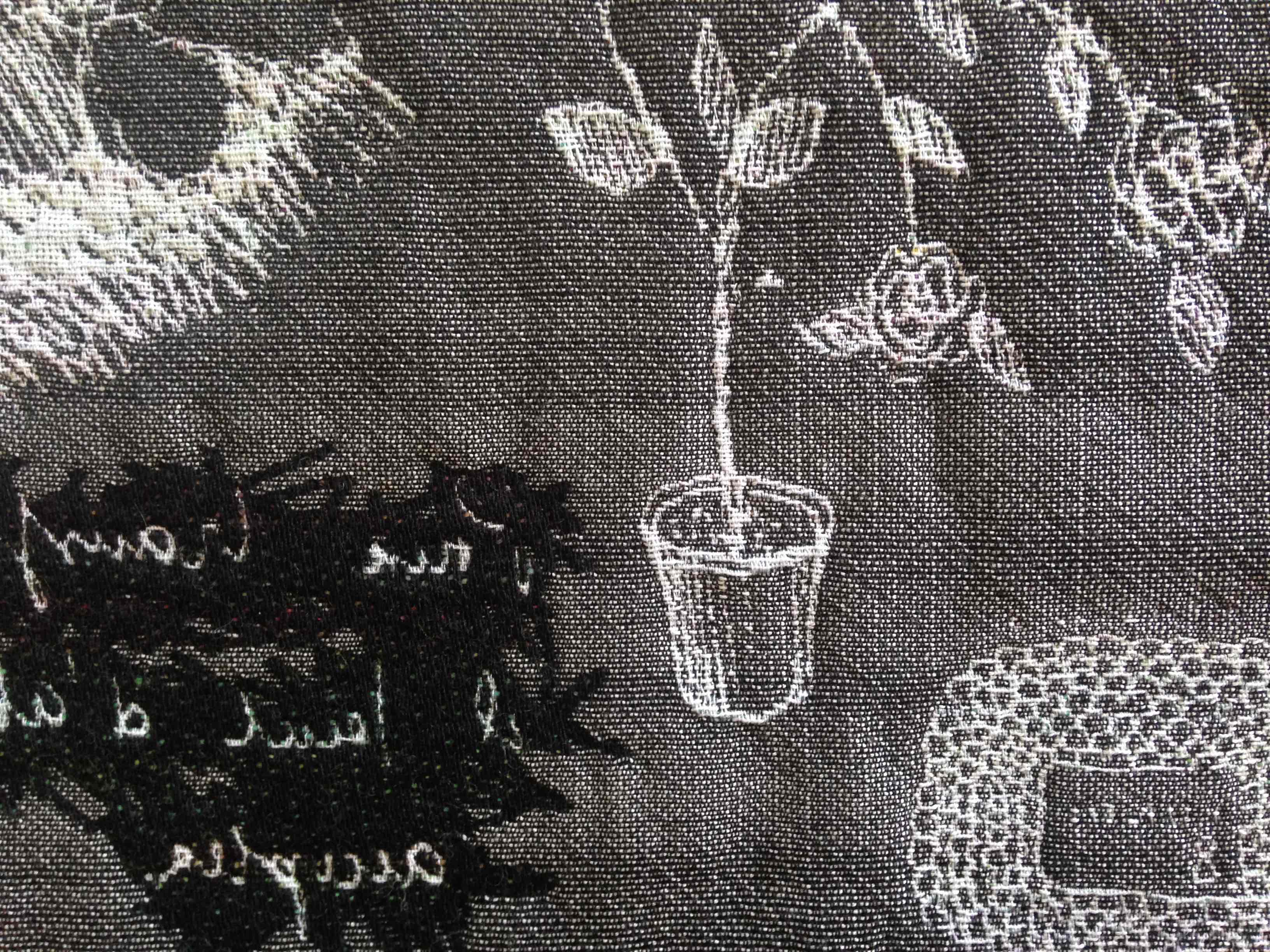 This woven work reinterprets engraving and scribbles in a combination featuring black drawings on a polychrome background and handwritten phrases in black on a white background. It is woven on a double black-and-white warp of 120 threads per inch and three wefts: white 2/16 cotton, black 2/16 cotolin, and polychrome handspun Corriedale wool. Three 35 cm wide panels form a triptych.
