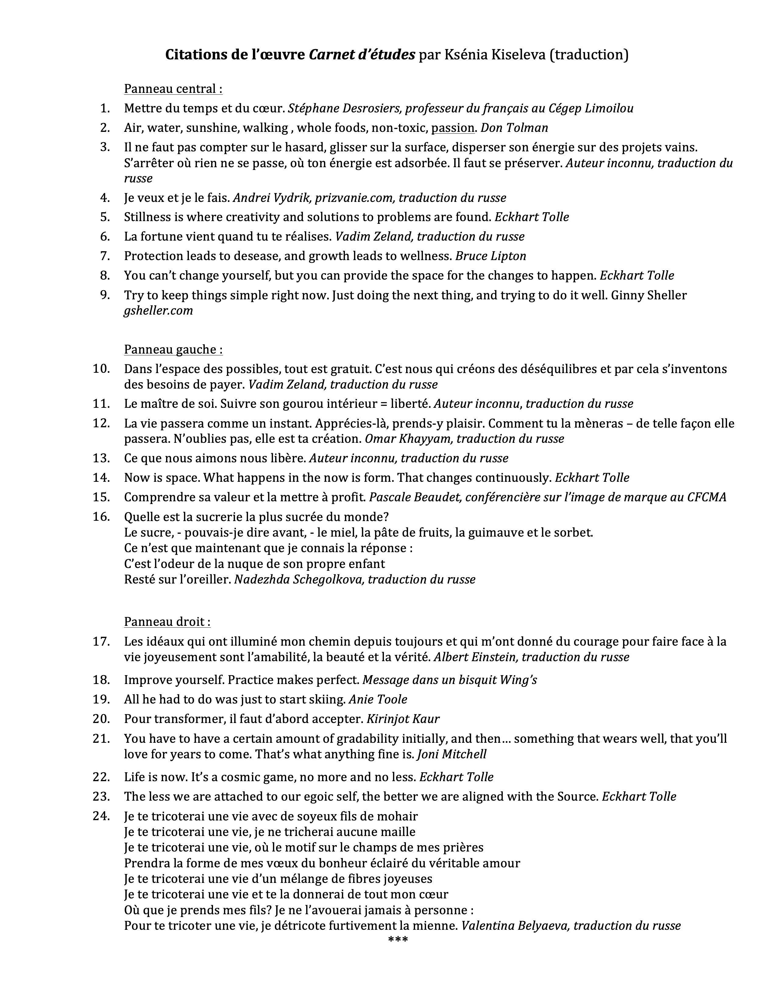 The aesthetic of my work is inspired by the technique of engraving : a layer of black ink is scratched with a quill pen to reveal an underlayer composed of multiple colors unified by optical blurring. Continuing with this aesthetic, I chose to work from drawings I made on the edges of course notes during my three years of college. These scribbles, made in a state of distraction, without any specific purpose or thought, are simple, made of black lines on white paper. Among these drawings, phrases of wisdom are introduced in French, English, and Russian, my mother tongue. These are quotes I have accumulated over time and which are important to me.