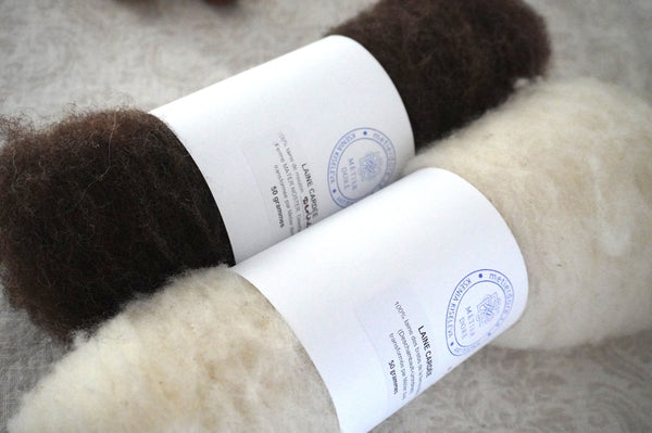 Pour vous lancer tout de suite dans le filage, 50 grammes de laine cardée transformée par Métier doré est inclut avec l'achat (couleur naturelle blanc ou brun).