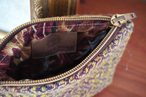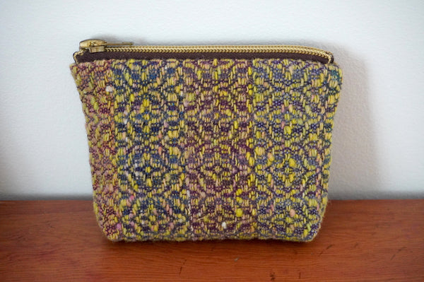Petite pochette en 100% laine tissée à la main dans une technique nord-américaine de Frappé, ou Chèvrefeuille, sur un métier à tisser traditionnel. La laine jaune-rose a été filée à la main à partir de la fibre de mouton transformée par l'artiste de A à Z (lavage de la toison brute, écharpillage, cardage, teinture).